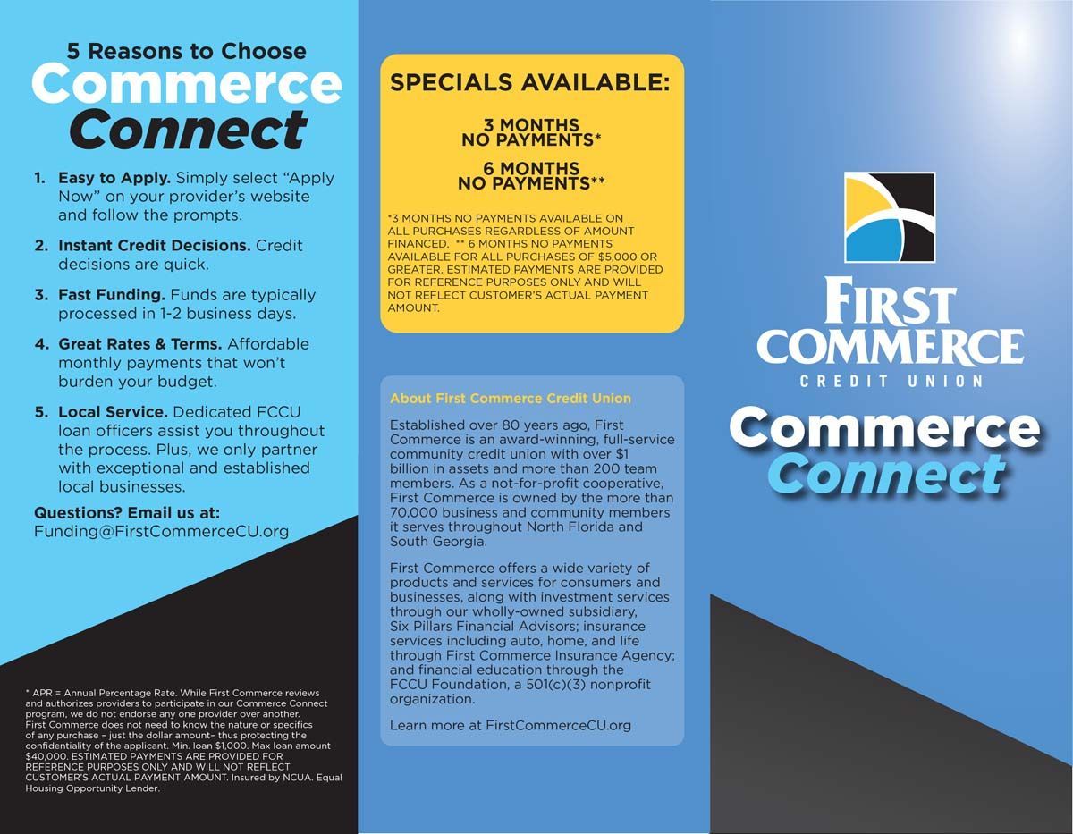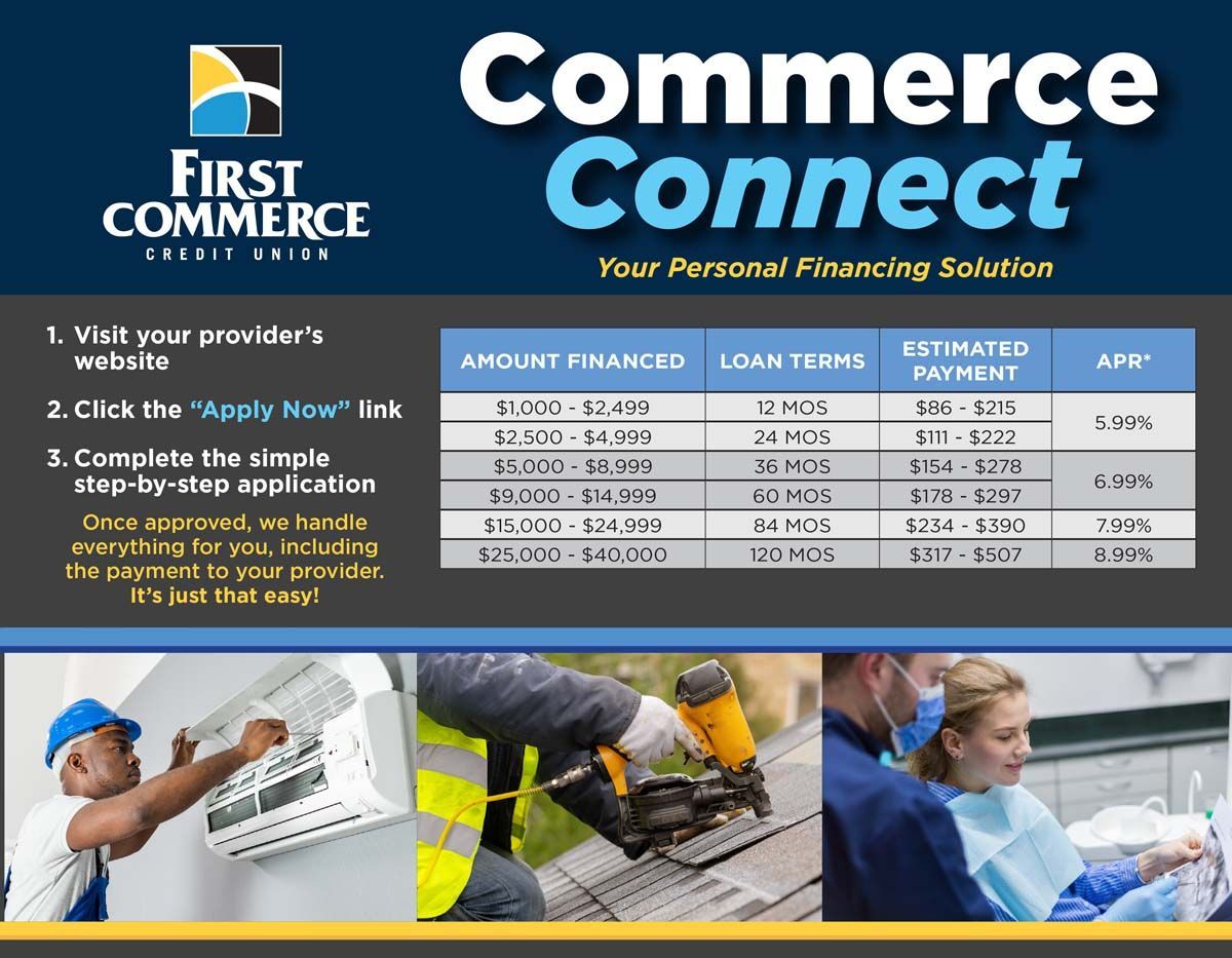 You don't want the cost of a new roof to prevent you from getting the replacement you need. Luckily, Hartsfield Roofing is proud to partner with First Commerce Credit Union to offer financing services to our customers. When you choose to finance with Commerce Connect, you'll appreciate that they offer instant credit decisions, fast funding and local loan services.